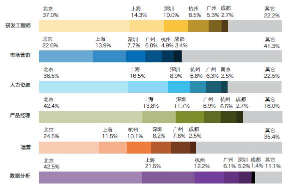 互聯(lián)網(wǎng)行業(yè)熱門人才最多集中在一線城市,北京的人才集中程度尤為突出,這與互聯(lián)網(wǎng)在北京的政策及區(qū)位優(yōu)勢相關(guān)。