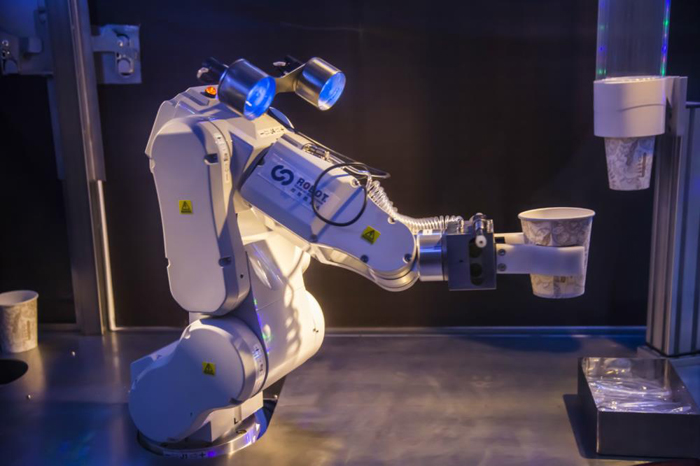 點(diǎn)一杯咖啡,咖啡機(jī)器人“小智”為你現(xiàn)場(chǎng)制作,還可實(shí)現(xiàn)拉花。“您的咖啡到了,請(qǐng)慢用!”完成制作后,“小智”親自將咖啡送到你的手中。擔(dān)任完咖啡師、送餐員,“小智”又化身為收銀員,你可通過(guò)支付寶、微信等在“小智”身上實(shí)現(xiàn)在線支付。