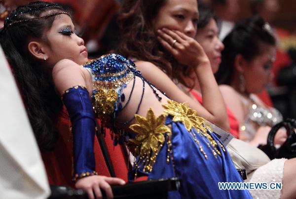 Hsu Tzu-yau reacts before her competition during a belly dance competition held in Taipei of southeast China's Taiwan, Sept. 4, 2010. (Xinhua/Fei Maohua)
