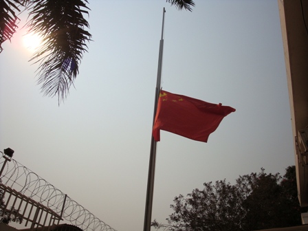 2010年8月15日,中國駐安哥拉使館舉行莊嚴(yán)肅穆的降半旗儀式,向甘肅舟曲特大山洪泥石流災(zāi)害遇難同胞志哀。