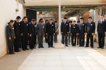 在王衛(wèi)臨時(shí)代辦帶領(lǐng)下,全體館員、新華社駐安記者身著正裝,胸佩白花,神情凝重,凝望國旗升至旗桿頂部后徐徐降下,之后集體默哀3分鐘。
