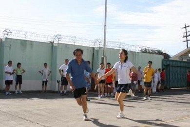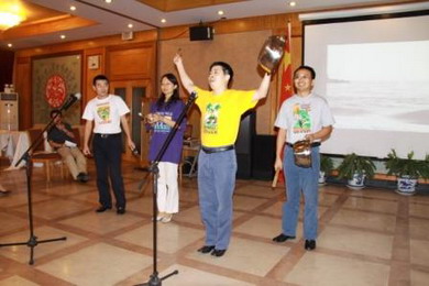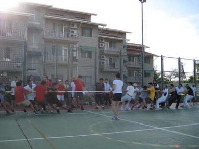 系列活動以下午的體育比賽拉開帷幕。在10人接力賽跑和6人游泳接力比賽中,男女參賽選手打破單位界限,分別組成3個臨時團(tuán)隊(duì)。經(jīng)過一番緊張激烈的角逐,“飛毛腿隊(duì)”和“海豚隊(duì)”分獲賽跑和游泳接力賽桂冠。爭奪最為激烈的是拔河比賽,三家單位分別派出10名隊(duì)員參賽。來自使館的大力士們在觀眾的助威聲中艱難地戰(zhàn)勝援圭醫(yī)療隊(duì),奪得冠軍。