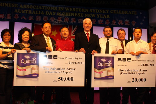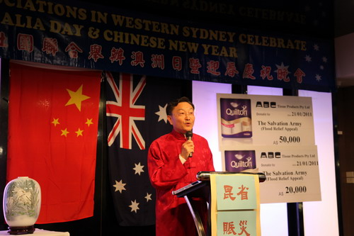 2011年1月21日晚,悉尼西區(qū)三十個華僑華人社團(tuán)在卡市隆重舉行慶祝澳洲日暨中國春節(jié)聯(lián)歡晚宴,同時為澳大利亞昆士蘭州水災(zāi)籌款募捐。駐悉尼總領(lǐng)事胡山、胡小蘭副總領(lǐng)事、多名澳大利亞聯(lián)邦議員、卡市市長、市議員以及西區(qū)華僑華人共500人出席。