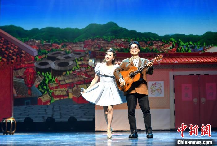 6月15日,海峽兩岸藝術交流活動在廈門啟動,“藝”心同行文藝演出同時舉行。本次活動包括海峽兩岸藝術交流節開幕文藝惠民演出、閩臺大學生魔術交流大會、海峽兩岸青少年街舞展演等內容。圖為大陸歌手鄭莉莉(左)與臺灣歌手葉東安合唱歌曲《外婆的澎湖灣》。中新社記者 呂明 攝