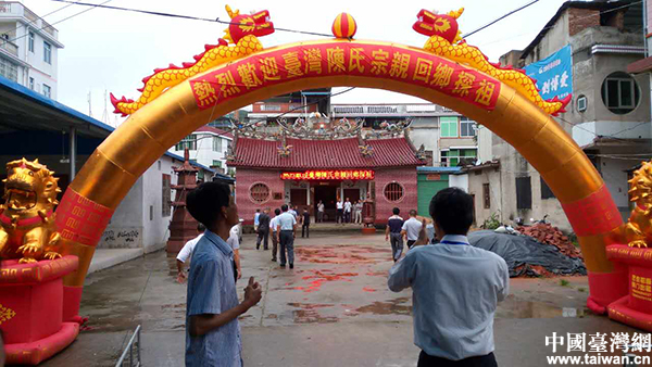 漳州南靖縣金山鎮(zhèn)霞涌村徑尾陳氏宗祠前大陸宗親搭起了歡迎彩門。(中國臺灣網(wǎng) 發(fā))