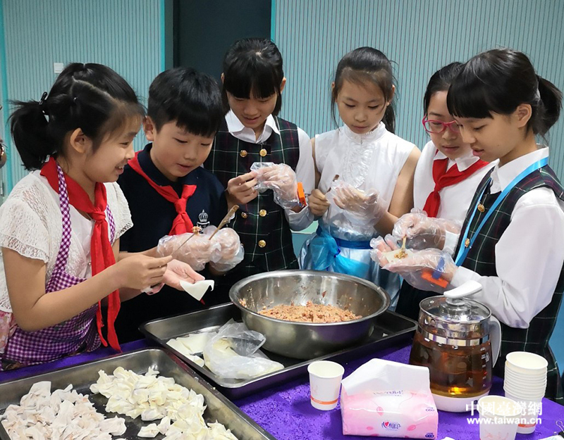 在福州中山小學,兩岸小朋友一起包肉燕。(中國臺灣網(wǎng)發(fā))