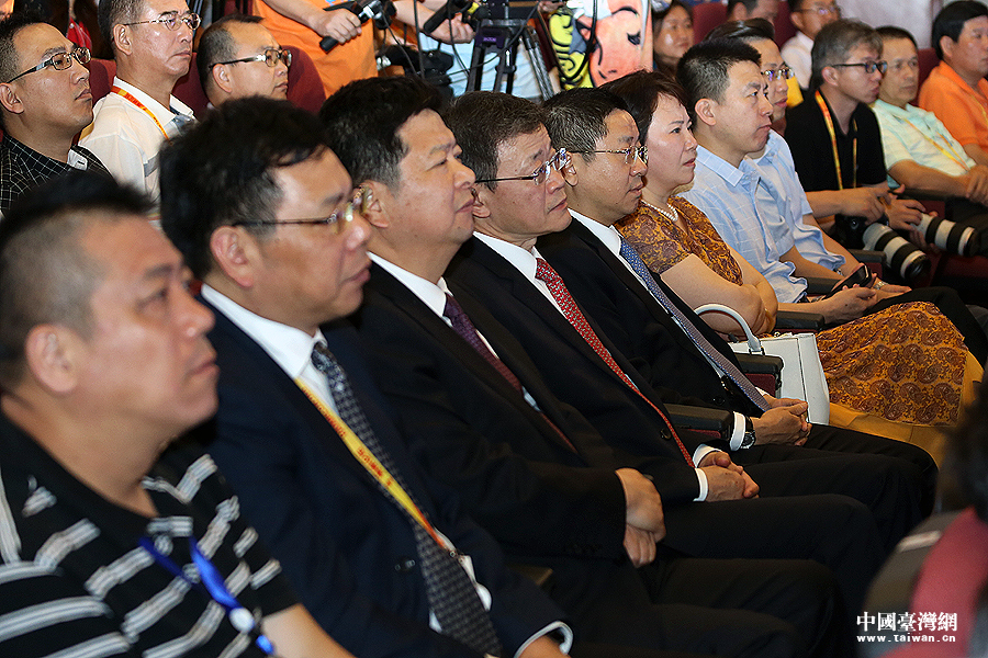 中共中央臺辦、國務院臺辦副主任龍明彪(左三)等領導與主辦方一同觀看“海論十年、精彩無限”海峽論壇十年故事匯展演。(中國臺灣網 尹賽楠 攝)
