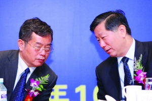 17日,中國(guó)證監(jiān)會(huì)主席尚福林(右)與中國(guó)社會(huì)科學(xué)院副院長(zhǎng)李揚(yáng)(左)在論壇上親切交談 本版圖片均為本報(bào)記者 史麗 攝