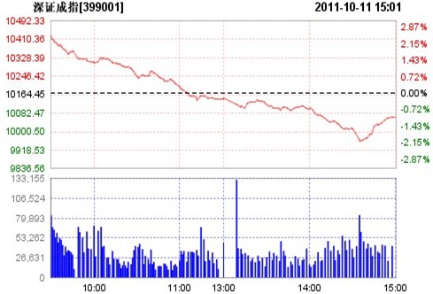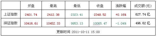 滬深股市午后震蕩走低,兩市股指漲跌不一。滬指跌破998和1664點(diǎn)連線(xiàn)支撐。煤炭板塊午后再次跳水,跌幅一度超過(guò)5%。兩點(diǎn)過(guò)后,滬指翻綠,深成指跌破萬(wàn)點(diǎn)大關(guān)。就大盤(pán)而言,滬指考驗(yàn)2319一帶的支撐;多空在深成指10000點(diǎn)重要關(guān)口再次展開(kāi)爭(zhēng)奪。盤(pán)面上,一改開(kāi)盤(pán)時(shí)的滿(mǎn)盤(pán)皆紅,僅金融等少數(shù)板塊走強(qiáng)。3G、家電、軍工等板塊跟隨煤炭殺跌。尾盤(pán)時(shí),兩市再次拉起,滬指收紅,深成指勉強(qiáng)收回萬(wàn)點(diǎn)。截止收盤(pán),上證指數(shù)收?qǐng)?bào)2348.52點(diǎn),漲幅+0.16%,成交627.74億;深證指數(shù)收?qǐng)?bào)10065.47點(diǎn),漲幅-1.04%,成交496.62億。