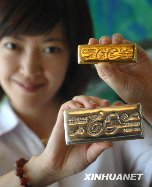 7月14日,工作人員展示新中國成立60周年紀念金銀條鳳舞系列。由中國印鈔造幣總公司制造發行、中鈔國鼎公司總經銷的中華人民共和國成立60周年紀念金銀條,將于7月23日在北京菜百商場首發。該套產品分為龍騰系列和鳳舞系列。新華社發