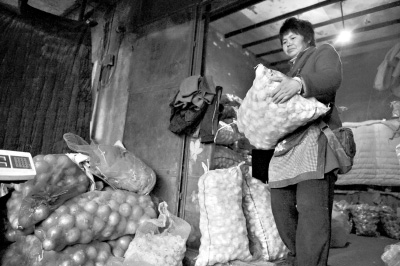 某農(nóng)貿(mào)批發(fā)市場一位大蒜批發(fā)商正在搬運大蒜。新華社記者王菲攝