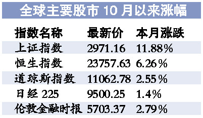 最近全球主要經濟體的經濟數據并沒有顯著改善,但多國貨幣競相貶值,成為股市上漲最為直接的推手。道瓊斯指數一度突破11100點。香港恒生指數9月以來上漲已達15%左右。A股方面,上周上證指數以8.49%的幅度領漲全球。