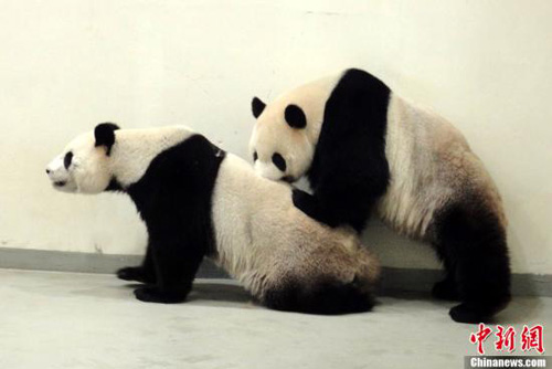 資料圖:“團團”、“圓圓”在進行互動。臺北市立動物園供圖