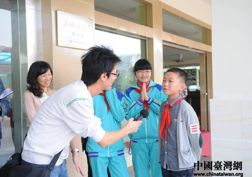 《兩岸愛心地圖》采訪組在都江堰采訪頂新新建小學(xué)學(xué)生。(圖片來源:四川省臺(tái)辦)