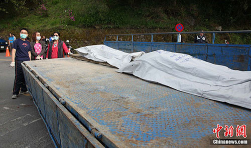 4月27日,臺灣阿里山景區發生小火車翻車事故,現場被當地警方封鎖。下午5點,最后兩個大陸游客遇難者遺體被抬上直升飛機。中新社發 沈存旭 攝