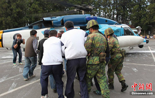 4月27日,臺灣阿里山景區發生小火車翻車事故,現場被當地警方封鎖。下午5點,最后兩個大陸游客遇難者遺體被抬上直升飛機。中新社發 沈存旭 攝