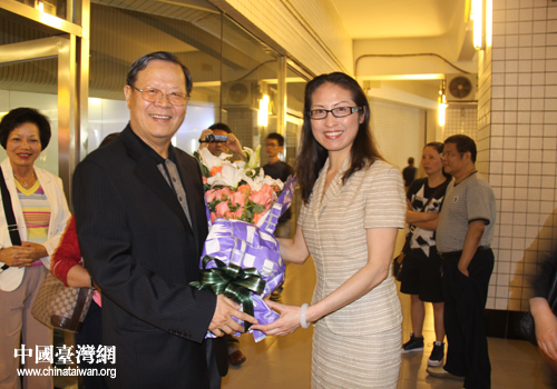 貴陽市臺辦主任李靜(右)熱情歡迎團(tuán)長廖正豪先生及其一行。(貴陽市臺辦 李慶斌 攝)
