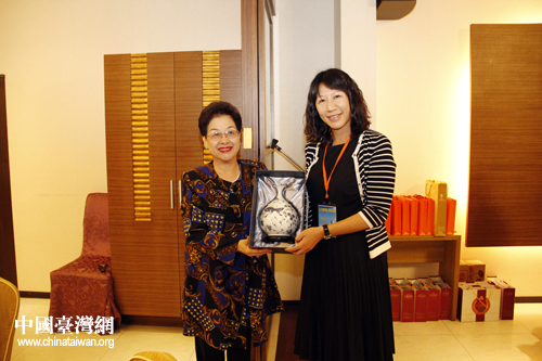 中國青年大陸研究文教基金會董事長李鐘桂博士與中國宋慶齡基金會基金部部長暨本次代表團團長唐九紅女士互贈禮物。 (中國臺灣網 于斯文 攝)