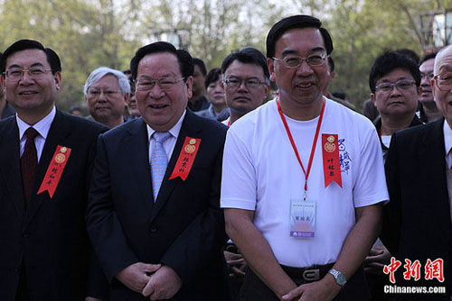 4月22日,北京清華大學(xué)校長(zhǎng)顧秉林(左二)與臺(tái)灣新竹清華大學(xué)副校長(zhǎng)葉銘泉(左三)共同出席北京清華大學(xué)新清華學(xué)堂揭幕儀式。4月24日是清華大學(xué)百年校慶紀(jì)念日,兩地清華大學(xué)將共同慶祝百年華誕,并各派副校長(zhǎng)帶隊(duì)前往參加慶典。中新社發(fā) 蘇丹 攝