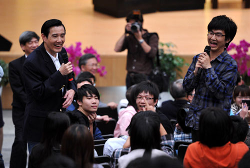 馬英九問在場陸生,是否會(huì)推薦同學(xué)來臺灣念書?陸生說“肯定會(huì)”,而且“現(xiàn)在就在推薦”。