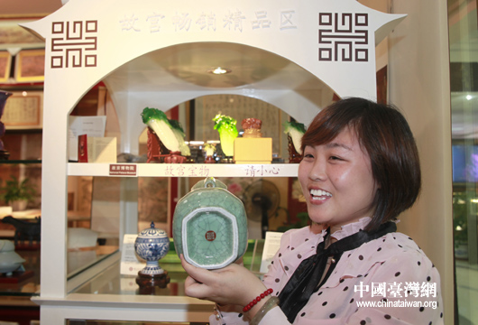 遠(yuǎn)景(故宮)文創(chuàng)生活館店員向記者展示經(jīng)銷的臺(tái)北故宮藏品仿品。(中國(guó)臺(tái)灣網(wǎng) 田云鵬 攝)