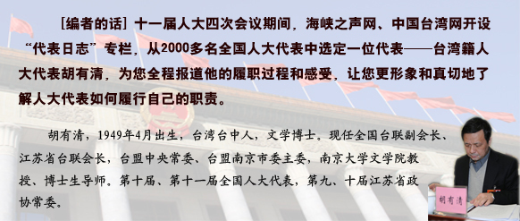胡有清代表是3月2日隨江蘇省代表團一同到京的,剛入駐賓館,他便不顧旅途勞累,開始整理修改自己向大會提交的建議。他告訴記者,當人大代表就是要反映民意,當臺灣省的人大代表,就是要把臺灣同胞的意見建議帶到全國兩會。