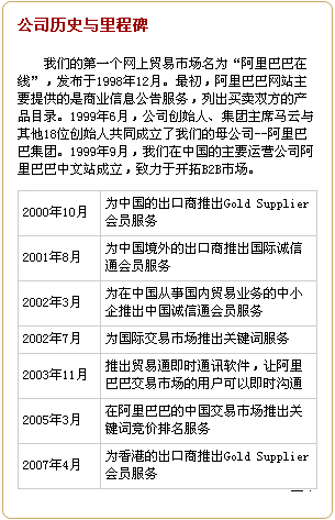 阿里巴巴的第一個(gè)網(wǎng)上貿(mào)易市場(chǎng)名為“阿里巴巴在線”,發(fā)布于1998年12月。最初,阿里巴巴網(wǎng)站主要提供的是商業(yè)信息公告服務(wù),列出買賣雙方的產(chǎn)品目錄。1999年6月,公司創(chuàng)始人、集團(tuán)主席馬云與其他18位創(chuàng)始人共同成立的母公司——阿里巴巴集團(tuán)。1999年9月,在中國(guó)的主要運(yùn)營(yíng)公司阿里巴巴中文站成立,致力于開(kāi)拓B2B市場(chǎng)。