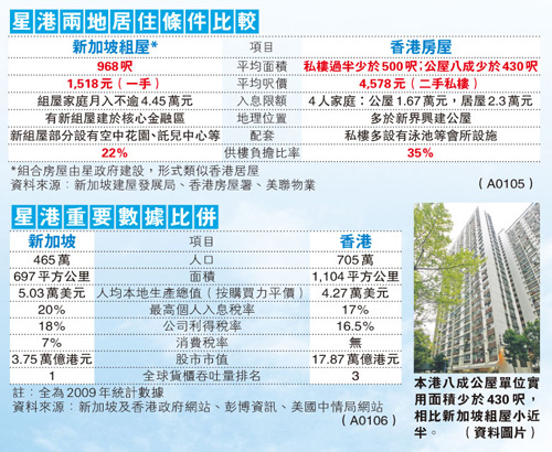 相反,根據香港房屋署08年數據,香港八成公屋單位實用面積少于430呎,一半私樓住戶居于少于500呎的單位。然而,400至500呎的單位,在新加坡多是提供予獨居長者居住。