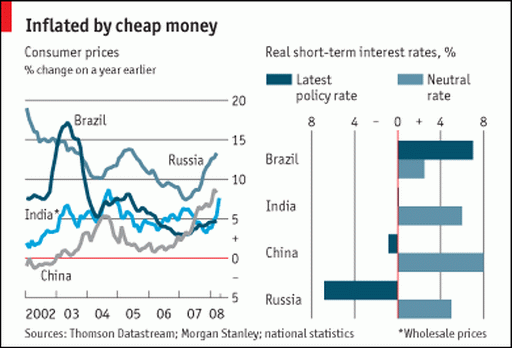 持續高漲的通脹數據更是雪上加霜。2008年8月份,印度的CPI漲幅高達12%,為14年來的最高點。這一數字比其能夠承受的5.5%的通脹目標高出兩倍多,比今年年初高出近3倍。