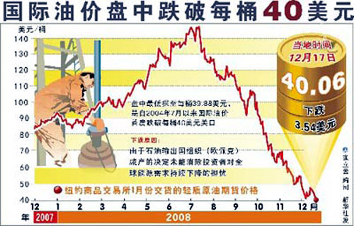 7月23日,油價首次跌破125美元。9月份,美國第四大投資銀行雷曼兄弟公司宣布破產,美國第三大投資銀行美林公司被美國銀行收購。一系列消息極大地打擊了投資者對全球經濟的信心,從而引發油價“跳水”。國際油價一路跌破100美元、50美元、40美元, 12月22日,紐約市場油價跌至每桶33.87美元。自從今年7月中旬以來,國際油價已經累計下跌了約73%。