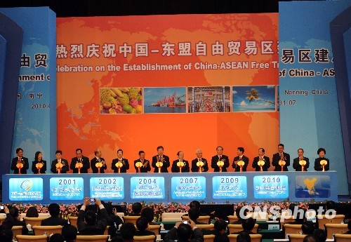 1月7日,中國(guó)—東盟自由貿(mào)易區(qū)建成慶祝儀式在南寧舉行。全國(guó)政協(xié)副主席黃孟復(fù)宣布儀式開(kāi)始,與會(huì)嘉賓用金鑰匙共同開(kāi)啟自貿(mào)區(qū)合作大門(mén)。中國(guó)商務(wù)部副部長(zhǎng)易小準(zhǔn)、東盟副秘書(shū)長(zhǎng)孫達(dá)姆、老撾副總理宋沙瓦·凌沙瓦、二OO七年諾貝爾經(jīng)濟(jì)學(xué)獎(jiǎng)獲得者埃里克·馬斯金等數(shù)百位嘉賓出席慶祝儀式。 中新社發(fā) 蔣雪林 攝