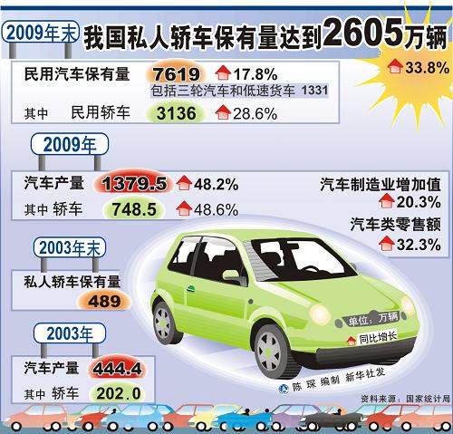 《中華人民共和國2009年國民經(jīng)濟(jì)和社會(huì)發(fā)展統(tǒng)計(jì)公報(bào)》顯示,2009年末,全國民用汽車保有量達(dá)到7619萬輛(包括三輪汽車和低速貨車1331萬輛),比上年末增長(zhǎng)17.8%,其中民用轎車保有量3136萬輛,增長(zhǎng)28.6%。