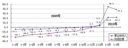 圖1:2009年至2010年3月營業(yè)總收入、實(shí)現(xiàn)利潤增幅變化情況(單位:%)