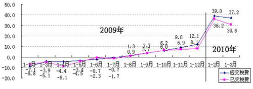 圖2:2009年至2010年3月應(yīng)交稅費(fèi)、已交稅費(fèi)增幅變化情況(單位:%)