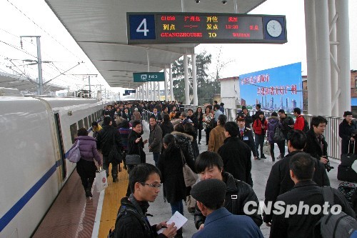 12月26日,武廣高鐵首班車抵達廣州北站。武廣高鐵正式通車運營,標志著中國步入高速鐵路新時代。 中新社發(fā) 余明 攝