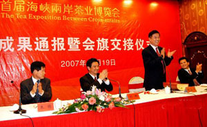 首屆海峽兩岸茶業(yè)博覽會在舉行,首屆茶博會茶業(yè)投資和訂貨合同簽約總金額達四十一點一九億元人民幣,利用臺資三億美元。