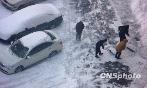 一月四日周一,在兩天大雪過后,北京市民上街鏟雪。市政府已經(jīng)在日前之夜號召市民企業(yè)、事業(yè)單位,各家自掃門前雪,分片包干,暢通北京交通。 中新社發(fā) 鄒憲 攝