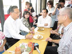 福建省長黃小晶(左一)在臺南市安平街區一家知名蝦卷店,邀請臺灣民眾一起享用美味的點心。圖片來源:臺灣《中國時報》