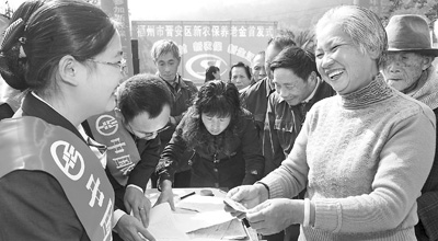 圖為2月1日,福州市晉安區壽山鄉嶺頭村61歲的何銀花老人(右)高興地領到新型農村社會養老保險銀行卡。