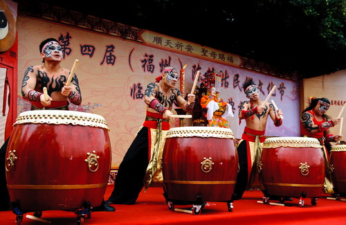 2月14日,臺灣“九天民俗技藝團”的演員在第四屆(福州)陳靖姑民俗文化節上擂響“九天戰鼓”。