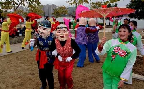 祭祀大典結束后,海峽兩岸的民俗文藝團體登場,獻上了精彩的民俗文藝演出。其中,臺灣“九天民俗技藝團”帶來了“歡喜神童”表演,夸張的藝術造型、活潑可愛的舞姿表現出濃郁的臺灣鄉土風情。