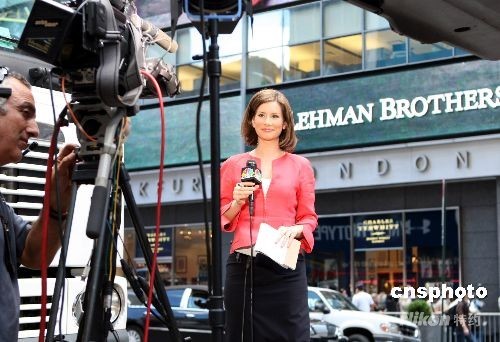 9月15日,美國有著158年歷史的第4大投資銀行雷曼兄弟公司向法院申請破產保護,當日紐約各大媒體的數十輛轉播車移師到雷曼兄弟公司總部外,全天候報道這一震驚華爾街的經濟事件。 中新社發 鄧悅 攝