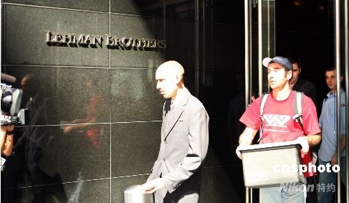 9月15日,美國有著158年歷史的第4大投資銀行雷曼兄弟公司于向法院申請破產保護,員工當日從雷曼兄弟公司位于紐約的總部大樓內將清理的辦公用品搬離公司。 中新社發 鄧悅 攝