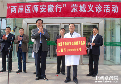 “兩岸醫師醫療咨詢公益活動”得到當地政府的歡迎和支持。安徽省金寨縣、蒙城縣主動承擔了義診咨詢活動的藥品費用。安徽臺盟總支部委員會得知情況后,捐贈二萬元藥品款助力公益;顒赢斕,臺盟安徽總支主委陳清海和副主委林敏分別向蒙城縣人民醫院和金寨縣人民醫院進行了現場捐贈。