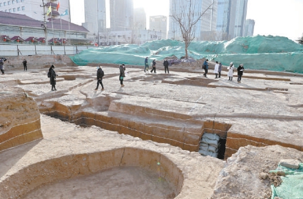 此次考古工作的領(lǐng)隊(duì)、市文物研究所研究館員丁利娜告訴記者,此處發(fā)現(xiàn)的護(hù)城河寬度是66米,距離西城墻外約17米,南北向的西城墻長度約有10米。記者在現(xiàn)場看到,西城墻護(hù)城河?xùn)|西堤岸已在兩個(gè)點(diǎn)位確定。地面上殘存的一塊城墻土堆已經(jīng)被保護(hù)起來。現(xiàn)場可以清晰看到當(dāng)時(shí)城墻夯土?xí)r留下的夯坑。