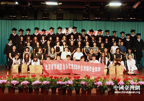 北京市第五十五中學(xué)19名臺(tái)灣籍同學(xué)畢業(yè)儀式,圖為北京市東城區(qū)臺(tái)辦代表到賀并與畢業(yè)同學(xué)留影(圖片來(lái)源:北京市東城區(qū)臺(tái)辦)