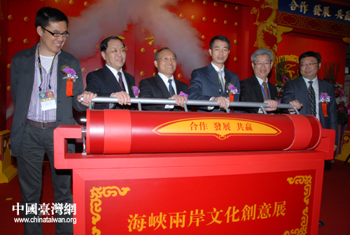 北京市貿(mào)促會(huì)副會(huì)長佘運(yùn)高先生,北京市人民政府對(duì)外事務(wù)辦公室副主任李洪海先生,北京市文化創(chuàng)意產(chǎn)業(yè)促進(jìn)中心副主任吳錫俊先生,臺(tái)灣對(duì)外貿(mào)易發(fā)展協(xié)會(huì)副秘書長黃文榮先生,臺(tái)北市文化局局長、臺(tái)北文化基金會(huì)執(zhí)行長劉維公先生,臺(tái)灣創(chuàng)意設(shè)計(jì)中心副執(zhí)行長黃振銘先生共同為2012海峽兩岸文化創(chuàng)意產(chǎn)業(yè)展揭幕。(圖片來源:北京市臺(tái)辦)