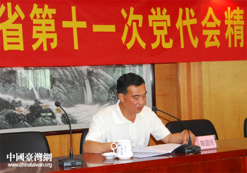 陳國(guó)興介紹了廣東省第十一次黨代會(huì)基本情況后,重點(diǎn)傳達(dá)學(xué)習(xí)了汪洋代表十屆省委向大會(huì)所作的報(bào)告和在省委十一屆一次全會(huì)上所作的重要講話。他指出,省臺(tái)辦一定結(jié)合當(dāng)前對(duì)臺(tái)工作的形勢(shì)和任務(wù),認(rèn)真制定方案,進(jìn)一步抓好會(huì)議精神的學(xué)習(xí)貫徹,把全體黨員、干部的思想認(rèn)識(shí)切實(shí)統(tǒng)一到會(huì)議精神上來。