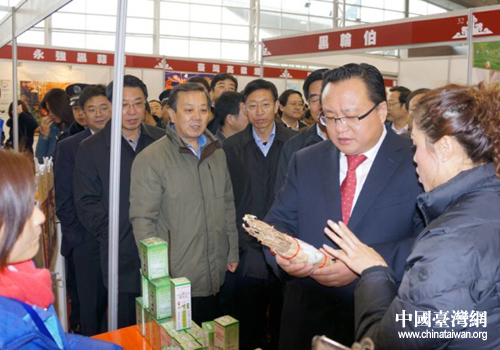 威海市臺辦主任于連波(左一)陪同市委書記、市人大常委會主任孫述濤(右二)參觀臺灣藥品。(威海市臺辦 林小偉 攝)