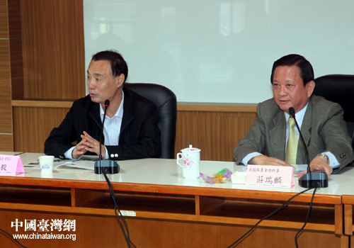 山東省農業(yè)教育培訓交流團赴臺交流考察,戰(zhàn)樹毅和南投縣農會總干事莊瑞麟?yún)⒓幼剷#▓D片來源:山東省臺辦)